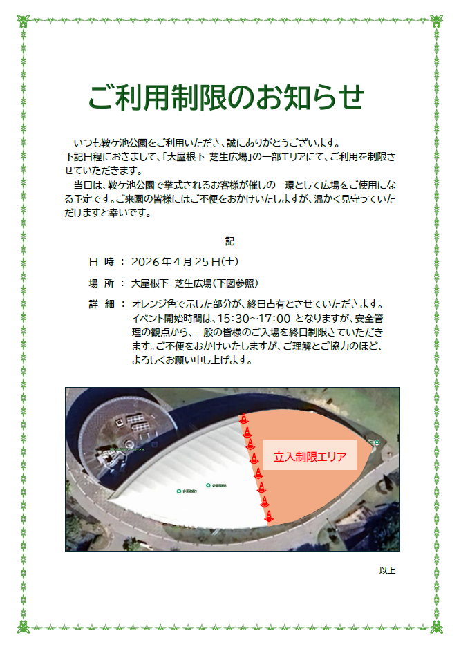 4/25(土) 一部利用制限のご案内 2026 4/21 公園からのお知らせ 2026.04.21 プレイハウス多目的ルームにつきましても、半面の利用制限がございます。ご来園の皆様にはご不便・ご迷惑をおかけしますが、ご理解とご協力を賜りますようお願い申し上げます。 公園からのお知らせ 2026.4/23水曜日 ヒツジの毛刈り 噴水広場、本日4/21(火)午後よりご利用できます。10月中旬頃まで、晴れた暑い日に稼働しています。