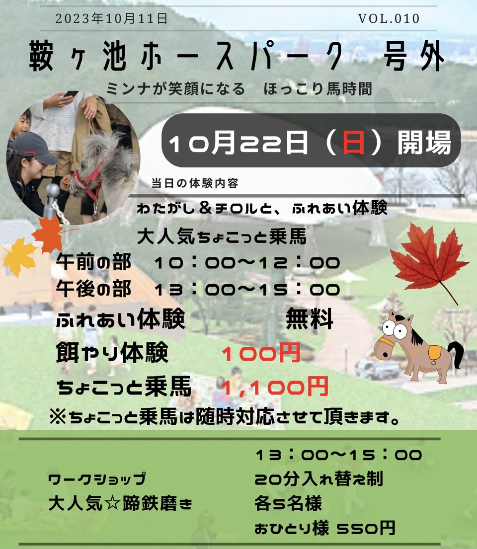 鞍ヶ池ホースパーク ふれあい体験&ちょこっと乗馬、そして蹄鉄磨き 2023 10/22 2023.10.16 ふれあい体験無料 餌やり体験100円 ちょこっと乗馬1,000円 蹄鉄磨き550円 鞍ヶ池内のホーストレッキング 2023年10月22日(日)ジビエマルシェ 10:00~15:00