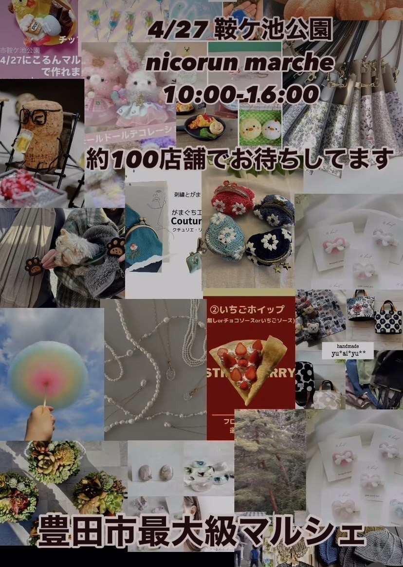 にこるんマルシェ 2025 4/27 2025.04.25 豊田市最大級のマルシェ。約100店舗出店。 5/25(日) 10:00-16:00 『ミニ!ワン・だら・りん!』 5/11(日) にこるんマルシェ開催
