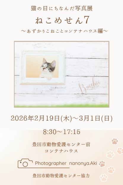 ねこめせん7 〜あずかりねことコンテナハウス編〜 2026 2/19 2026.02.14 豊田市動物愛護センター前コンテナハウスにて、猫の日にちなんだ写真展 2月19日(木)〜3月1日(日) 月曜日は定休日※祝日は開館しております。 鞍ケ池公園コミュニティツアー21 2/22(日) 『わんワンダーフェス』開催
