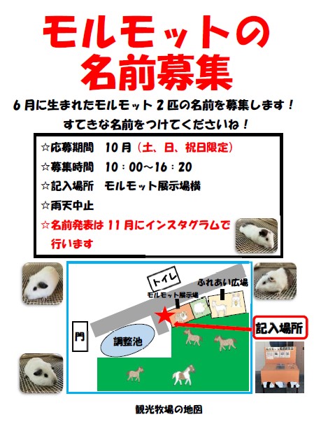 モルモットの名前募集 2025 10/11 2025.10.07 10月の土日祝限定で6月に生まれたモルモット2匹の名前を募集します! 10/18(土)エミューの羽でしおをつくろう モルモットの名前募集