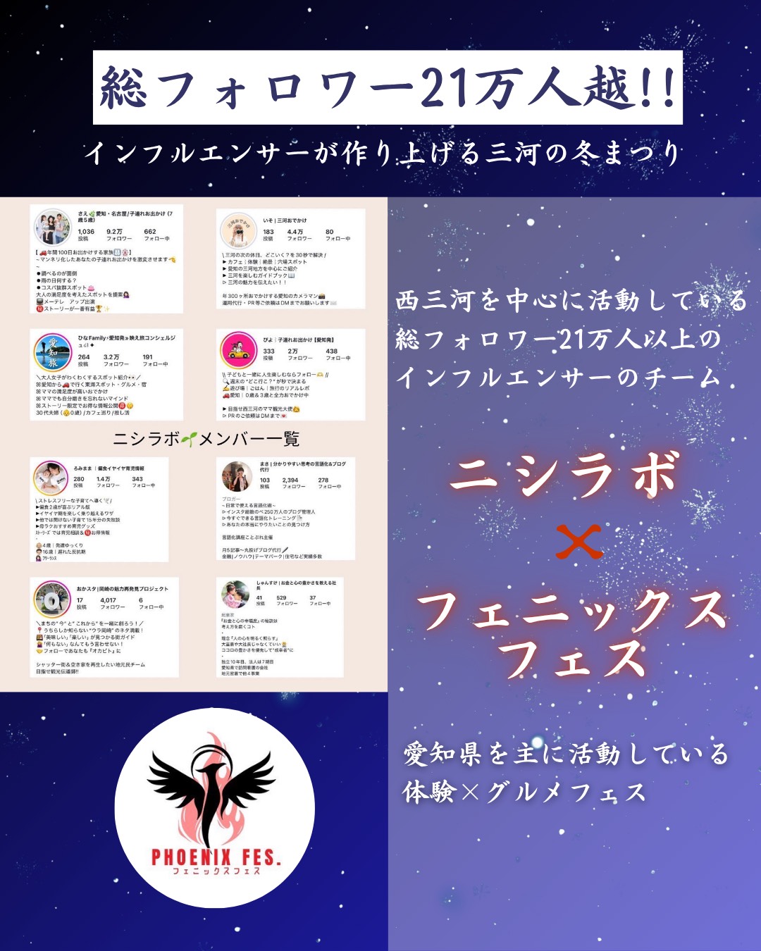 12/27(土)~28(日) 『冬祭り』開催 2025 12/27 2025.10.27 総フォロアー21万人越えのインフルエンサーが作り上げる三河の冬祭りです‼家族や友達と遊びに来てね💛 動物愛護フェスティバル 1/17(土)~18(日) フェニックスフェス 開催