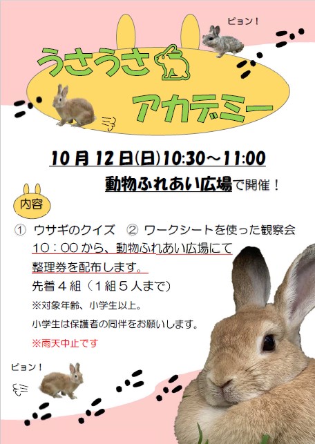 10月12日(日)うさうさアカデミー 2025 10/12 2025.10.07 10:30~11:00 動物ふれあい広場にて ①ウサギのクイズ ②ワークシートを使った観察会 先着4組(1組5人まで) モルモットの名前募集 10月13日(月)鞍ヶ池ZOOスポーツ大会