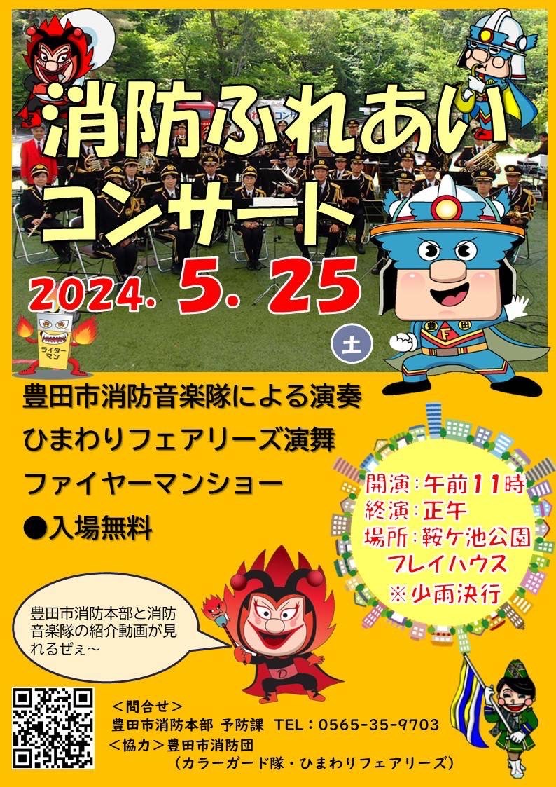 2024.5.25 SAT. 消防ふれあいコンサート 11:00-12:00 2024 5/25 2024.05.25 豊田市消防音楽隊による演奏 ひまわりフェアリーズ炎舞 ファイヤーマンショー 5/19【追加】KURAGAIKE Park-Trec 開催 6月8日(土)いけいけ鞍ヶ池おいでんまつり